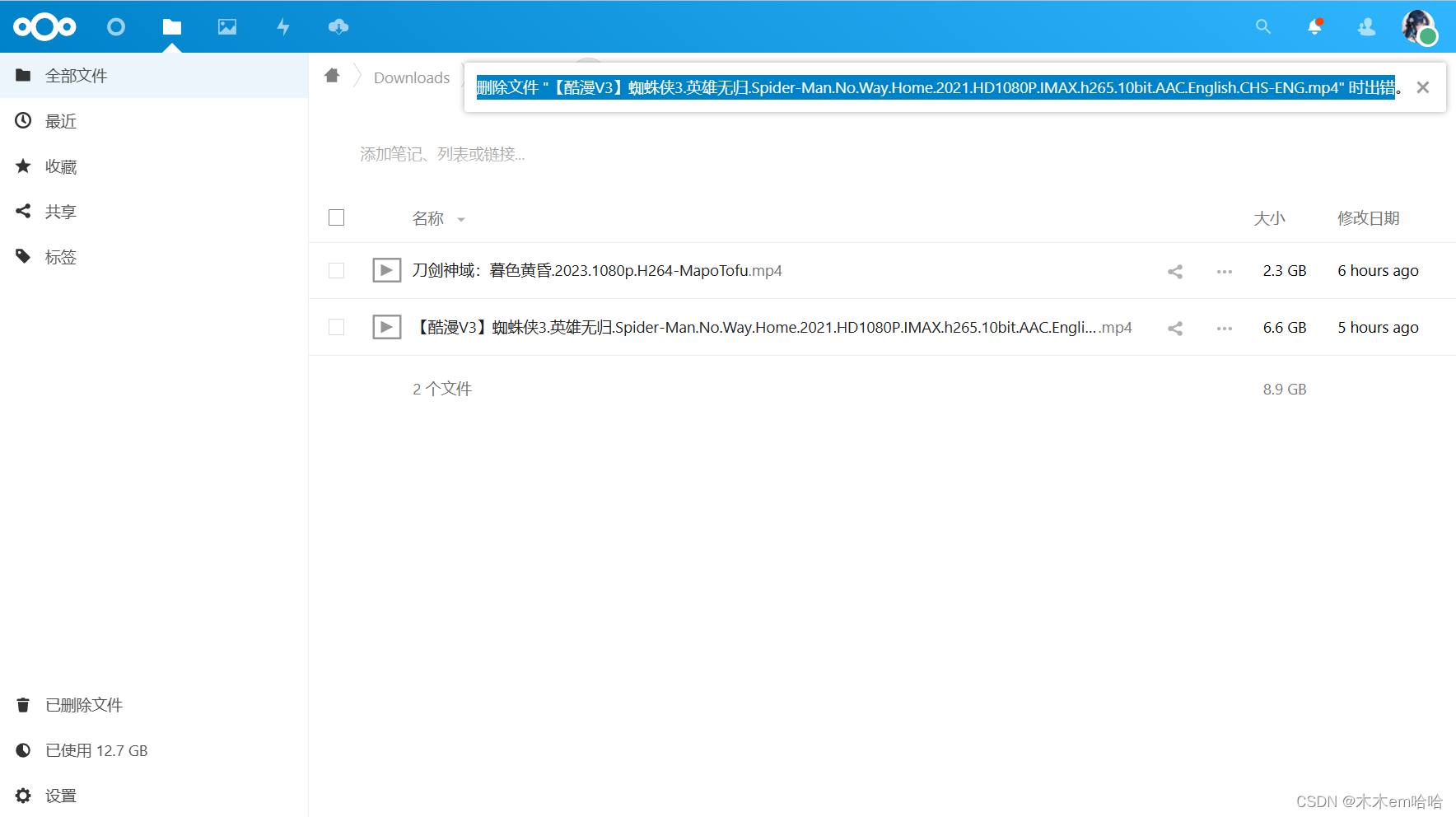 删除文件 "【酷漫V3】蜘蛛侠3.英雄无归.Spider-Man.No.Way.Home.2021.HD1080P.IMAX.h265.10bit.AAC.English.CHS-ENG.mp4" 时出错